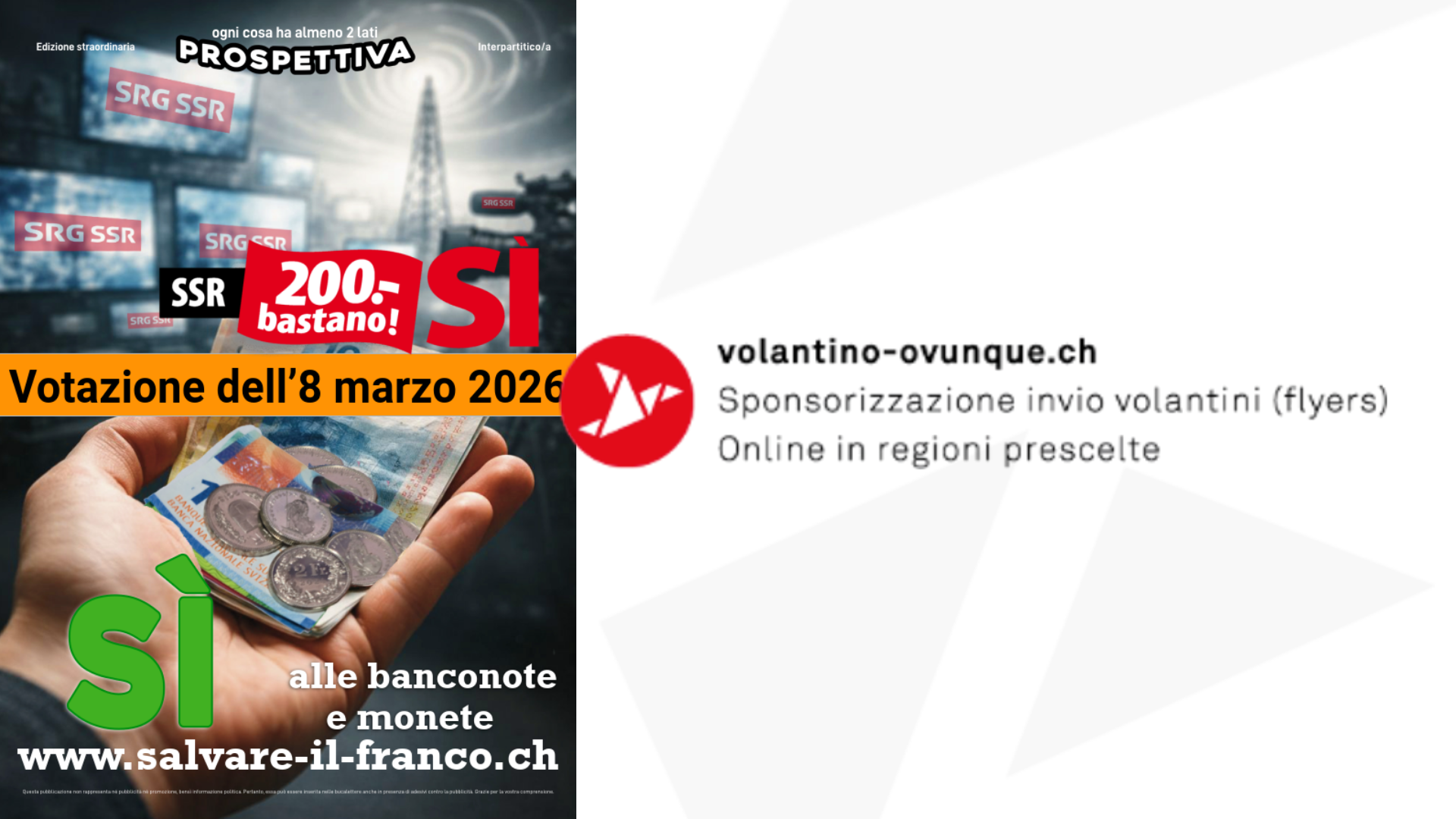 Su «Volantino ovunque», può sponsorizzare l’invio di un giornale di votazione di 8 pagine relativo alla votazione popolare federale del 08.03.2026: l’iniziativa popolare «Sì a una valuta svizzera indipendente e libera con monete o banconote (Il denaro contante è libertà)» e l’iniziativa popolare «200 franchi bastano! (Iniziativa SSR)», nel Comune a sua scelta. Se un intero Comune è troppo costoso, può anche unirsi ad altri e finanziare l’invio insieme tramite una sponsorizzazione condivisa.