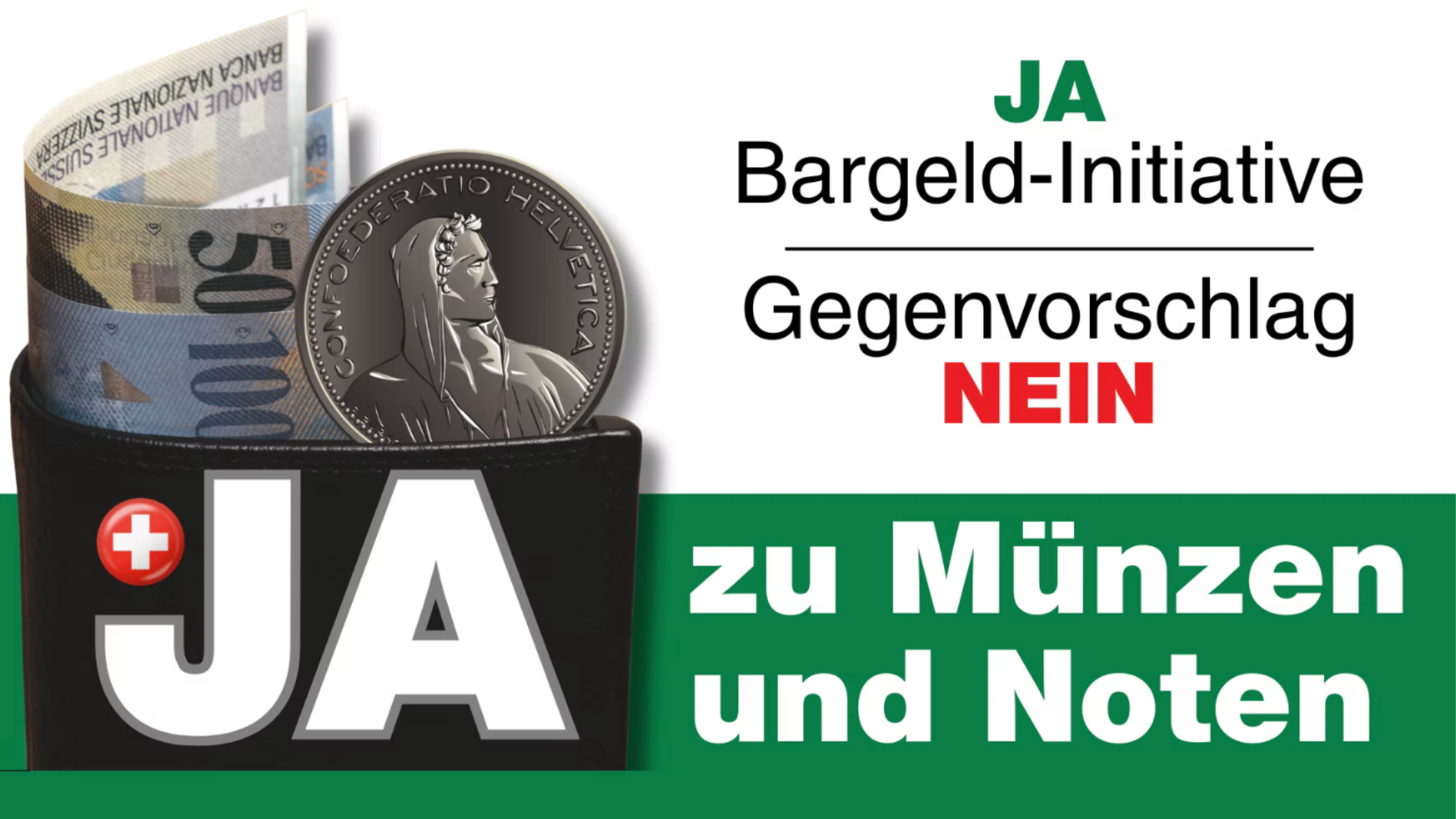 Nur mit der Volksinitiative schreiben wir das Bargeld als Münzen und Noten in die Bundesverfassung – wo es zur Erhaltung auch hingehört. Der trügerische Gegenvorschlag lässt weiterhin die Hintertür für die Abschaffung des Schweizer Bargeldes als Münzen und Noten offen. Stimmen Sie JA zur Initiative und NEIN zum Gegenvorschlag!