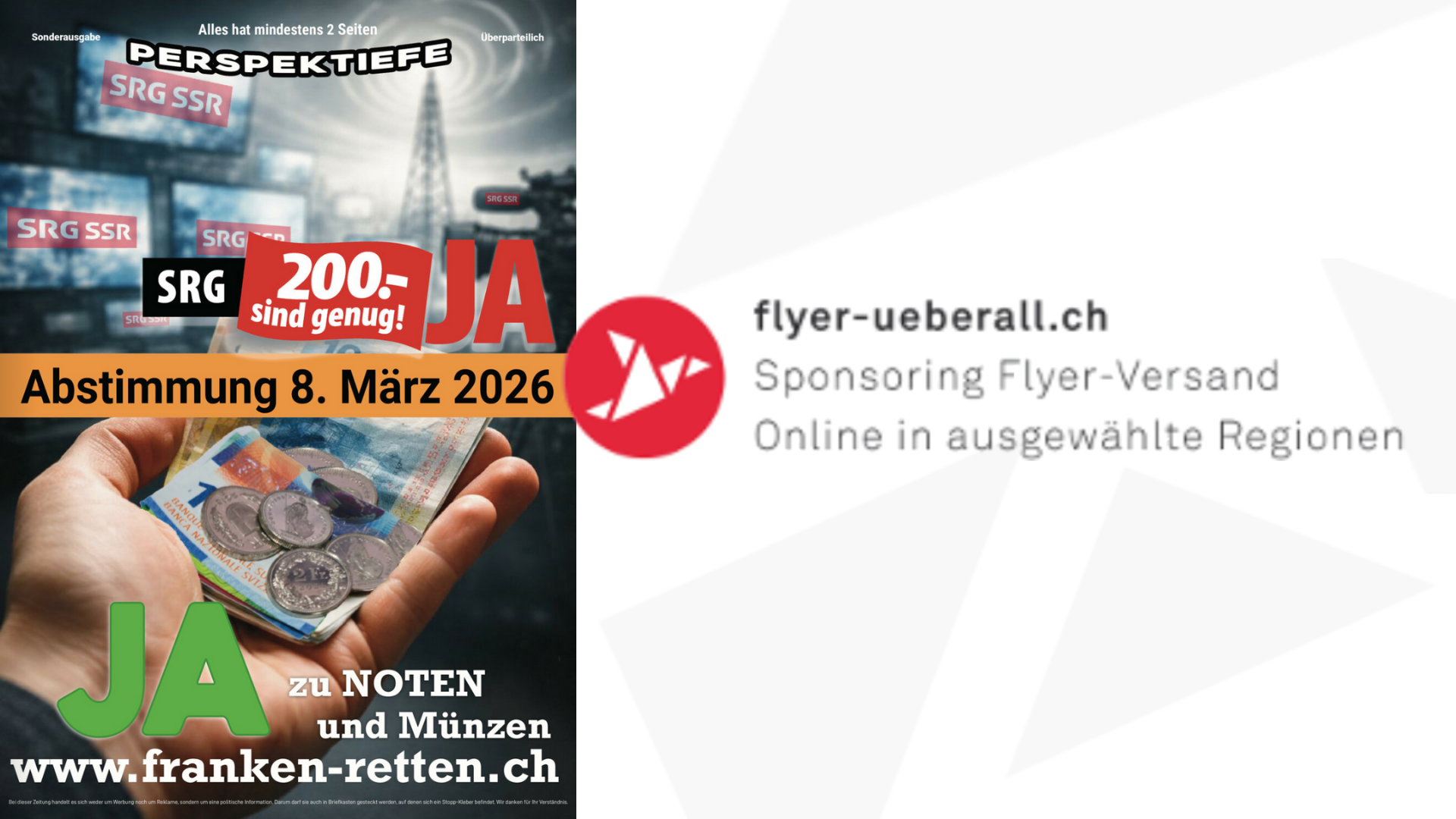 Auf «Flyer überall» können Sie den Versand einer 8-seitigen Abstimmungs-Zeitung zur Volksabstimmung vom 8. März 2026 («Bargeld ist Freiheit» und «200 CHF sind genug») in einer Gemeinde Ihrer Wahl sponsern. Falls ein ganzer Ort zu teuer ist, können Sie sich auch mit anderen zusammenschliessen und den Versand gemeinsam über ein geteiltes Sponsoring finanzieren.